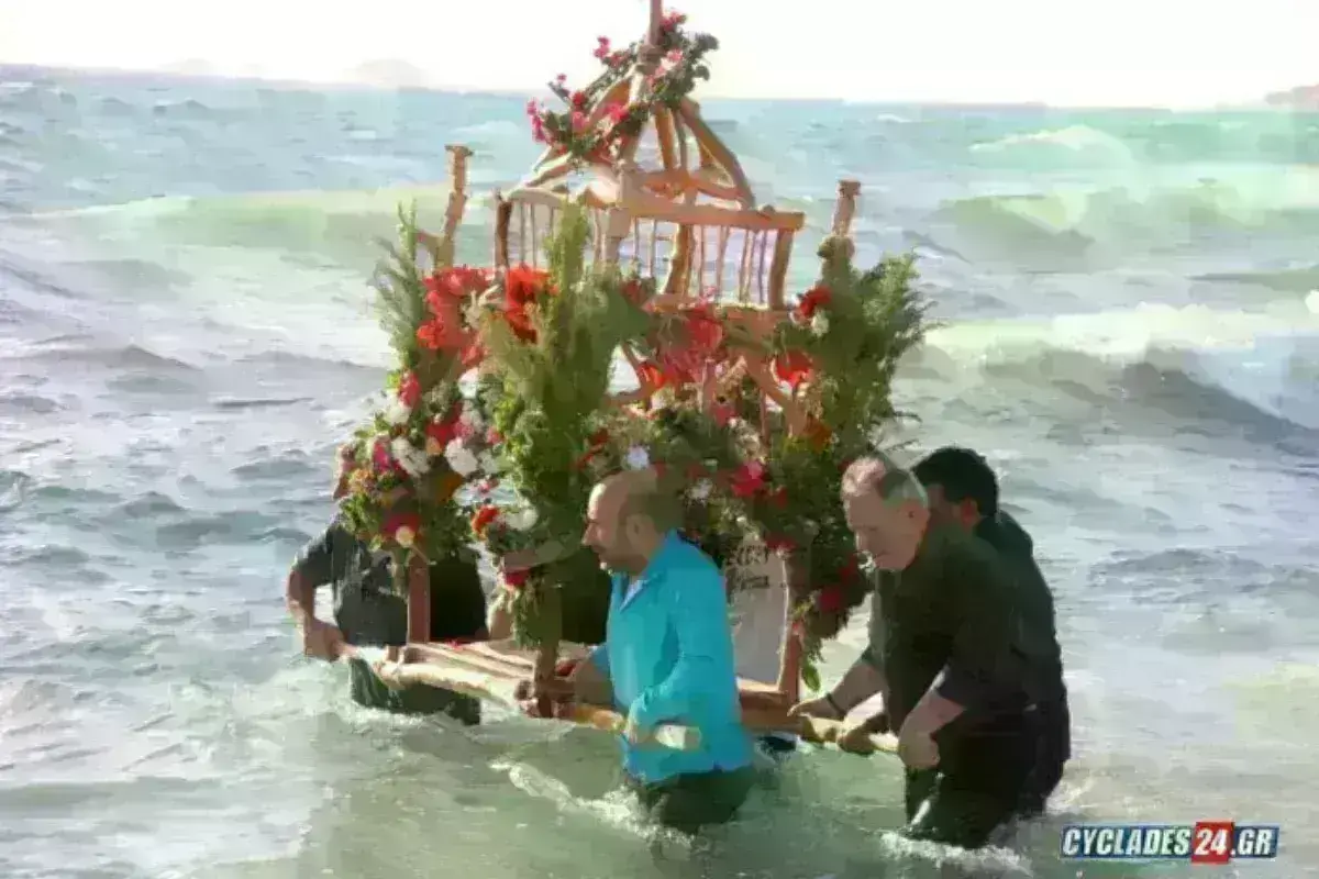 Όπως φαίνεται στις εικόνες που μεταδίδει το Cyclades24.gr, ο Επιτάφιος είναι φτιαγμένος από ξύλα και ελάχιστα στολισμένος , την ώρα που τον συνοδεύουν οι ψαλμωδίες των πιστών, στην περιφορά του, εντός της θάλασσας.