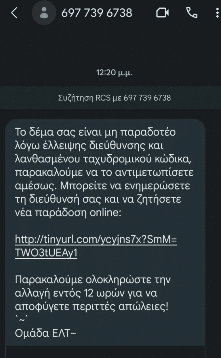 Όπως φαίνεται σε SMS που εστάλη σήμερα το πρωί σε κινητό τηλέφωνο, οι απατεώνες αφού επαναλαμβάνουν την παγίδα με δήθεν «έλλειψη διεύθυνσης και λανθασμένο ταχυδρομικό κώδικα» στη συνέχεια βάζουν και ένα τελεσίγραφο για την ολοκλήρωση της απάτης.
