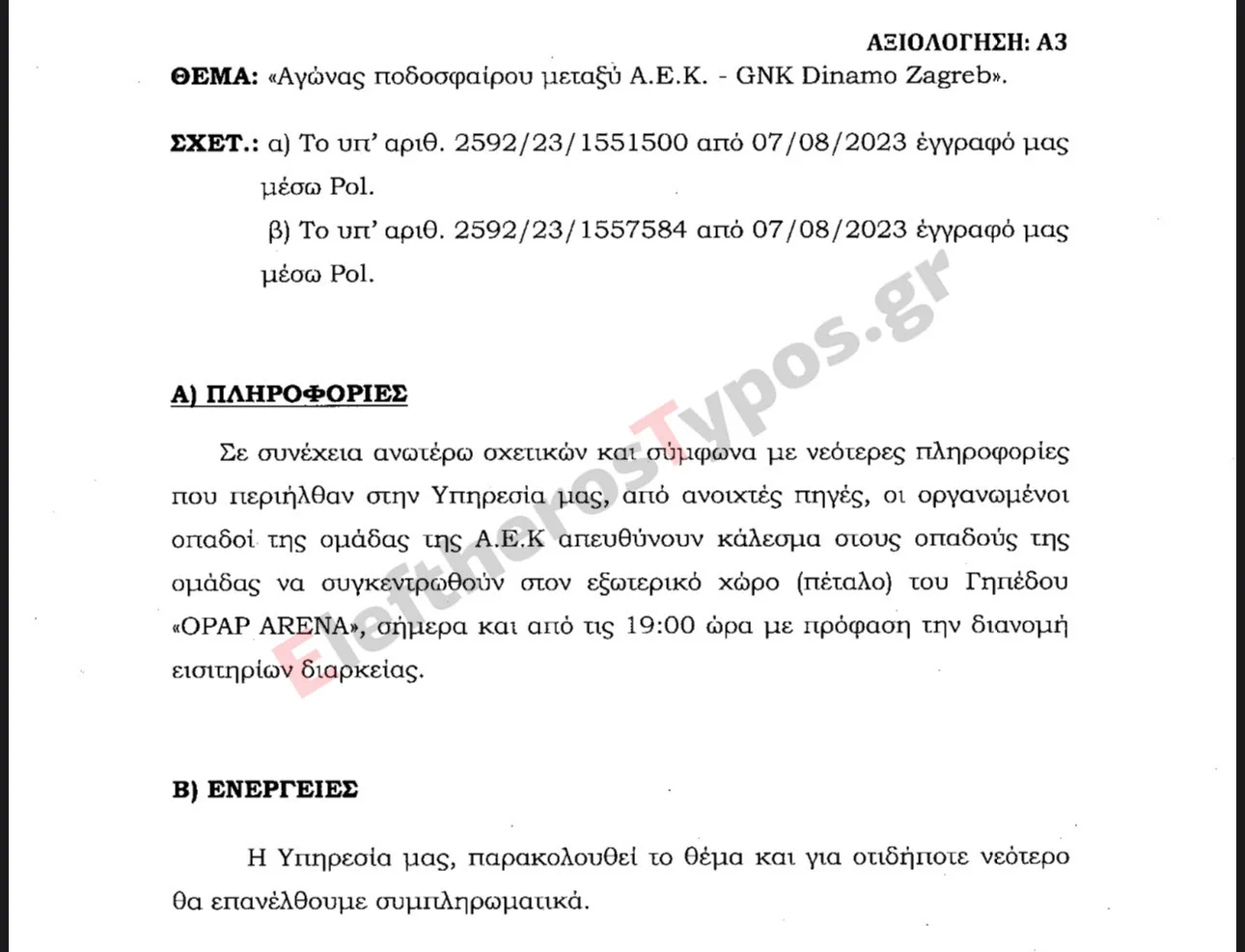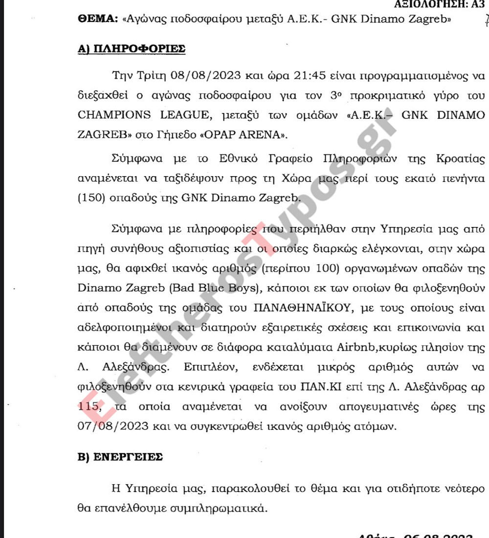 Το πρώτο έγγραφο αναφέρει χαρακτηριστικά: «Σύμφωνα με πληροφορίες που περιήλθαν στην Υπηρεσία μας από πηγή συνήθους αξιοπιστίας και οι οποίες διαρκώς ελέγχονται, στη χώρα μας θα αφιχθεί ικανός αριθμός (περίπου 100)οργανωμένων οπαδών της DINAMO ZAGREB (Bad Blue Boys), κάποιοι εκ των οποίων θα φιλοξενηθούν από οπαδούς της ομάδας του ΠΑΝΑΘΗΝΑΪΚΟΥ, με τους οποίους είναι αδελφοποιημένοι και διατηρούν εξαιρετικές σχέσεις και επικοινωνία, και κάποιοι διαμένουν σε διάφορα καταλύματα Airbnb, κυρίως πλησίον της Λ.Αλεξάνδρας. Επιπλέον, ενδέχεται μικρός αριθμός αυτών να φιλοξενηθούν στα κεντρικά γραφεία του ΠΑΝ.ΚΙ επί της Λ. Αλεξάνδρας αρ. 115, τα οποία αναμένεται να ανοίξουν απογευματινές ώρες της 07/08/2023 και να συγκεντρωθεί ικανός αριθμός ατόμων».