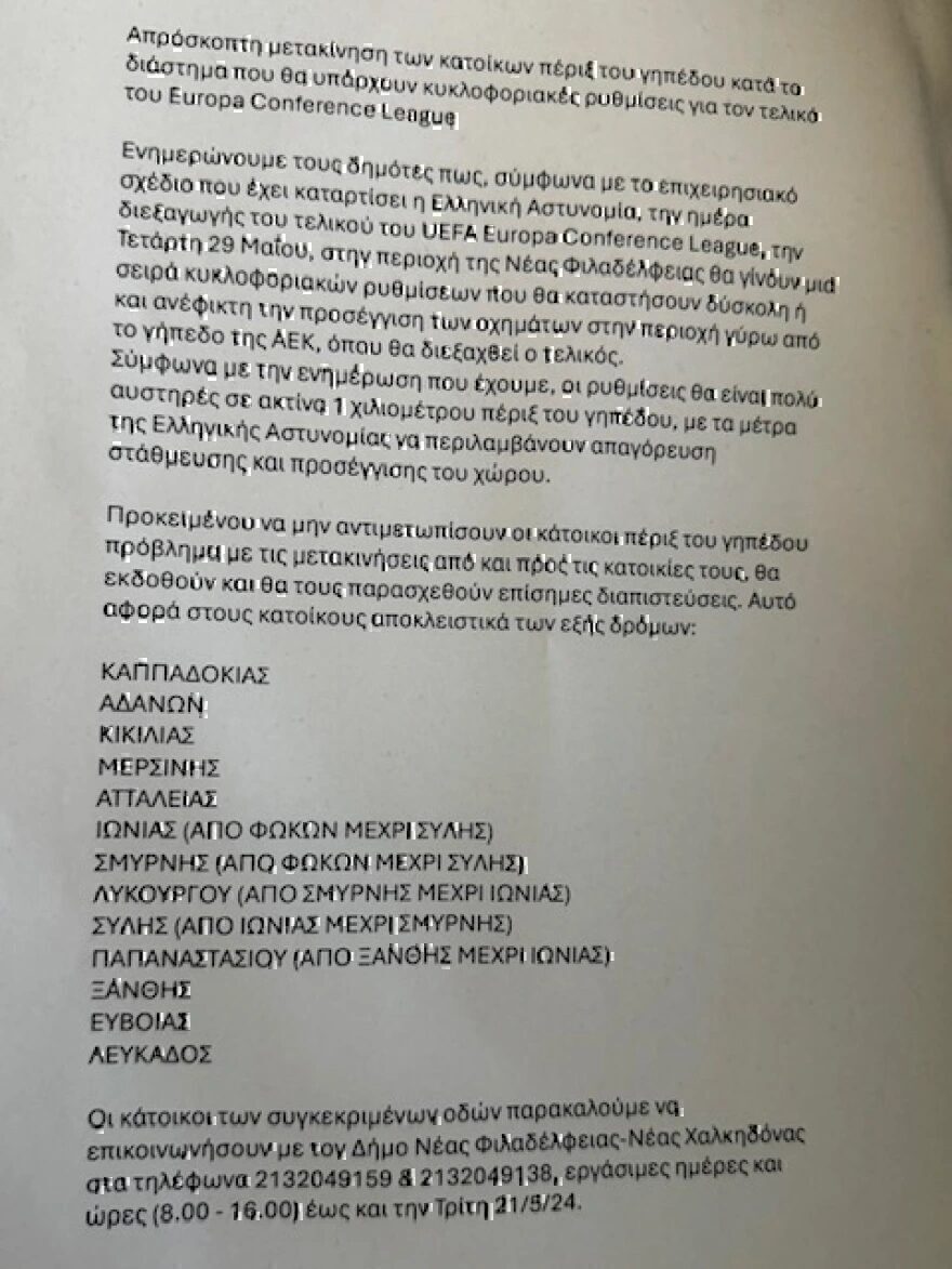 «Οι κυκλοφοριακές ρυθμίσεις θα είναι πολύ αυστηρές σε ακτίνα ενός χιλιομέτρου με τα μέτρα της ΕΛΑΣ να περιλαμβάνουν απαγόρευση στάθμευσης και προσέγγισης χώρου». Επίσης ενημερώνουν τους κατοίκους ότι «θα εκδοθούν και θα τους παρασχεθούν επίσημες διαπιστεύσεις».