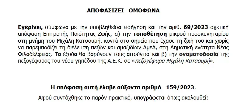 Ο Δήμος Νέας Φιλαδέλφειας αποφάσισε να τιμήσει τη μνήμη του οπαδού της ΑΕΚ και στο τελευταίο Δημοτικό Συμβούλιο πάρθηκαν δύο αποφάσεις.