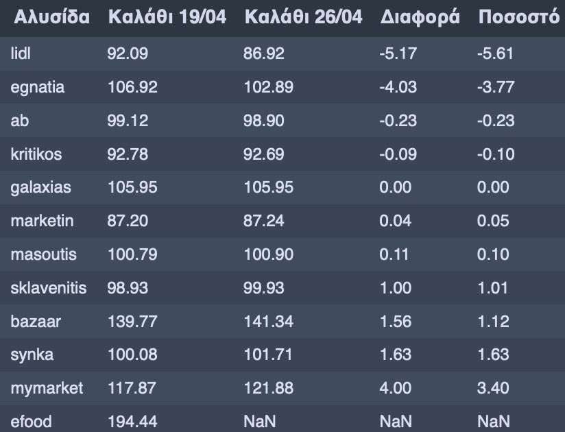 25η εβδομάδα εφαρμογής από το «Καλάθι του Νοικοκυριού» και τα αποτελέσματα είναι τα εξής: Από 1134 προϊόντα 32 (2.82%) παρουσίασαν αύξηση, 48 (4.23%) παρουσίασαν μείωση, και 1054 (92.95%) παρέμειναν σταθερά! -1% μείωση πάλι στο σύνολο της αξίας του «Καλαθιού». Συνεχίζουμε την… pic.twitter.com/NohL26XOn4