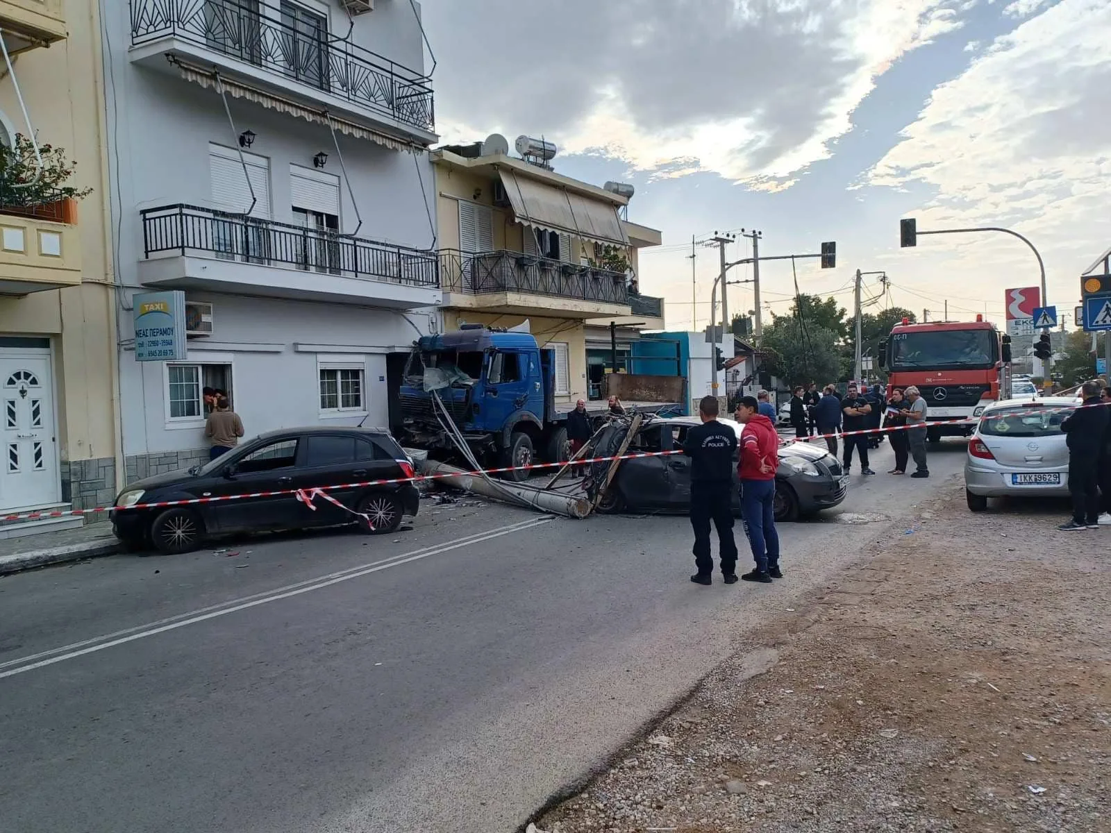 Συγκεκριμένα, το φορτηγό προσέκρουσε σε κολώνα κι έπεσε στη συνέχεια πάνω σε τρία σταθμευμένα ΙΧ αυτοκίνητα.