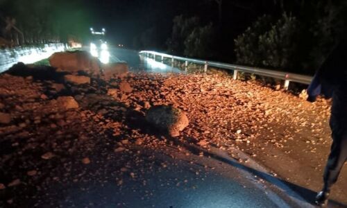 Χθες το βράδυ εκδηλώθηκε μία ακόμη μεγάλη κατολίσθηση. Το ένα ρεύμα του δρόμου έκλεισε από βράχια και πέτρες που αποκολλήθηκαν και κατέληξαν στο οδόστρωμα, χωρίς ευτυχώς την ώρα εκείνη να διέρχεται κάποιο όχημα.