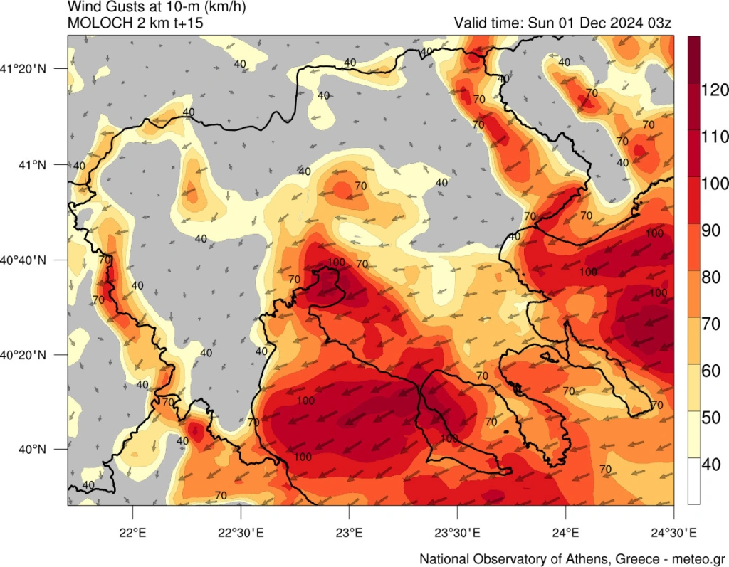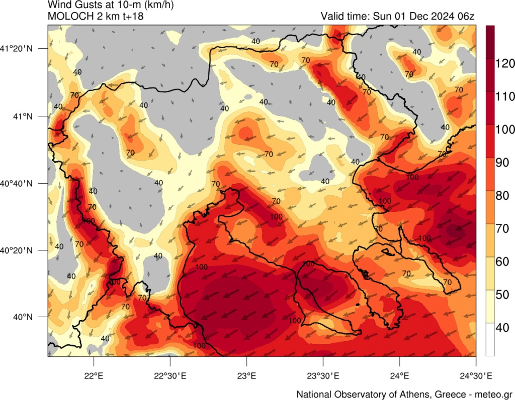 Εκτός από τα μεγάλα ύψη βροχής, προβλήματα προκαλούν και οι θυελλώδεις ανατολικοί άνεμοι που πνέουν στη Βόρεια Ελλάδα. Ήδη σε περιοχές της Θεσσαλονίκης έχουν καταγραφεί ριπές ανέμου άνω των 80 km/h το Σάββατο 30/11 και οι επόμενοι δύο προγνωστικοί χάρτες από το αριθμητικό μοντέλο πρόγνωσης του Εθνικού Αστεροσκοπείου Αθηνών/meteo.gr δείχνουν ότι οι ριπές ανέμου θα φτάνουν και τα 100 km/h τις πρωινές ώρες της Κυριακής 1 Δεκεμβρίου 2024 (πρώτος χάρτης για 05:00 και ο δεύτερος για 08:00 ώρα Ελλάδας). Η ροή θερμών και υγρών αερίων μαζών από το Αιγαίο Πέλαγος προς τους ορεινούς όγκους της Μακεδονίας και της Θεσσαλίας πολύ πιθανό να οδηγήσει σε εκ νέου ισχυρά επεισόδια βροχόπτωσης, κυρίως πλησίον ορεινών όγκων.