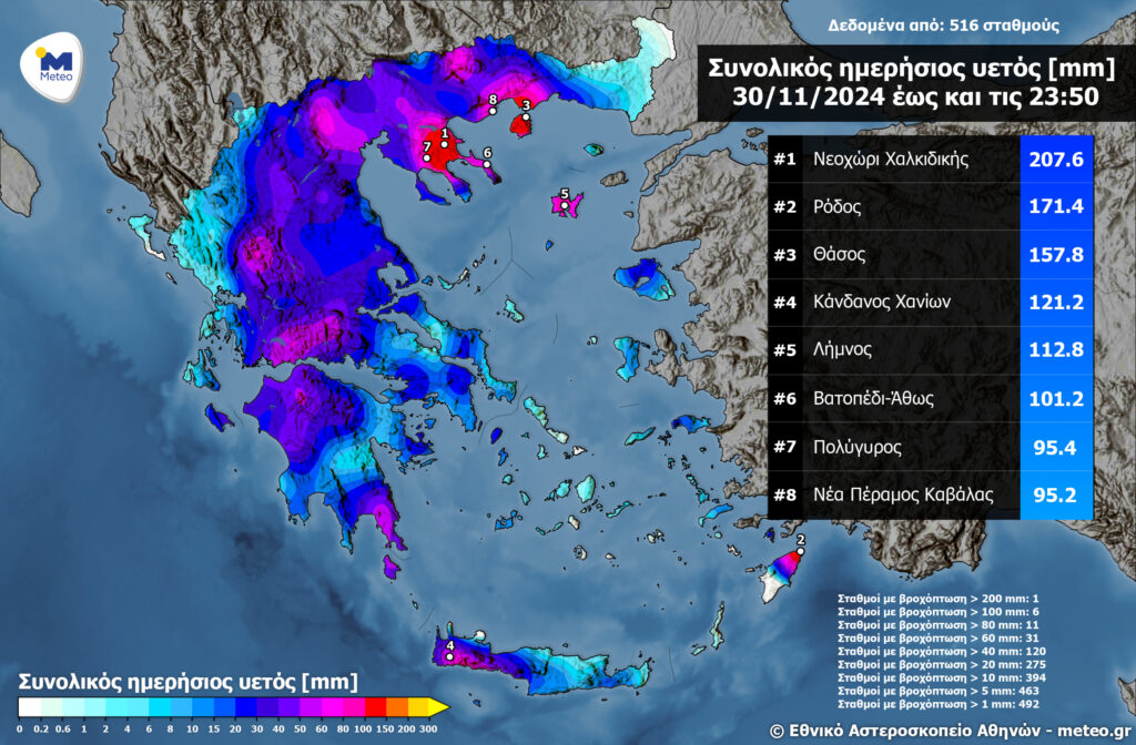 Ξεπέρασε τα 200 mm το συνολικό ημερήσιο ύψος βροχής στο Νεοχώρι Χαλκιδικής το Σάββατο 30 Νοεμβρίου 2024, ενώ στην πόλη της Ρόδου, στη Θάσο, στον Κάνδανο Χανίων, στη Λήμνο, και στο Βατοπέδι καταγράφηκαν περισσότερα από 100 mm ύψους βροχής από το δίκτυο μετεωρολογικών σταθμών του Εθνικού Αστεροσκοπείου Αθηνών/meteo.gr. Ο παρακάτω χάρτης παρουσιάζει την κατανομή του ύψους βροχής που καταγράφηκε στη χώρα μας το Σάββατο 30/11, καθώς και οι 8 μεγαλύτερες τιμές.