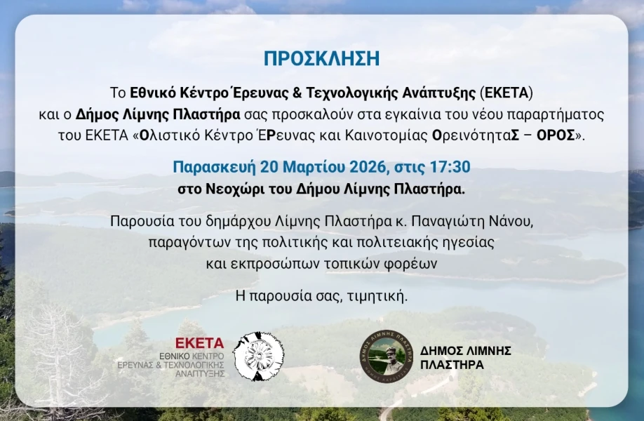 Τα εγκαίνια του νέου παραρτήματος του ΕΚΕΤΑ θα πραγματοποιηθούν την Παρασκευή 20 Μαρτίου στις 17:30 μ.μ., στο Νεοχώρι του δήμου Λίμνης Πλαστήρα.