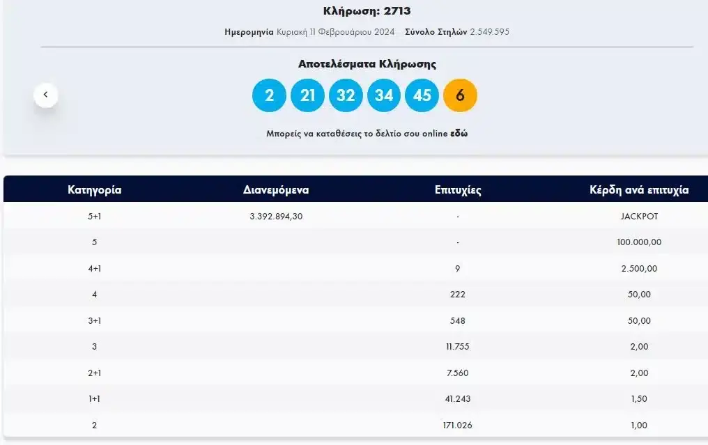 Οι τυχεροί αριθμοί λοιπόν, στη σημερινή κλήρωση Τζόκερ είναι οι εξής: 2, 21, 32, 34, 45 και Τζόκερ ο αριθμός 6.