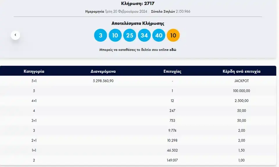 Οι τυχεροί αριθμοί λοιπόν, στη σημερινή κλήρωση Τζόκερ είναι οι εξής: 3, 10, 25, 34, 40 και αριθμός Τζόκερ το 10.