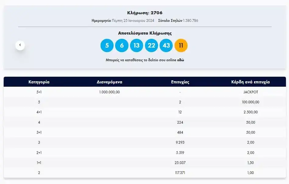 Οι τυχεροί αριθμοί λοιπόν, στη σημερινή κλήρωση Τζόκερ είναι οι εξής: 5, 6, 13, 22, 43 και Τζόκερ ο αριθμός: 11