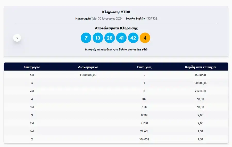 Οι τυχεροί αριθμοί λοιπόν, στη σημερινή κλήρωση Τζόκερ είναι οι εξής: 7, 13, 28, 41, 42 και αριθμός Τζόκερ το 4.