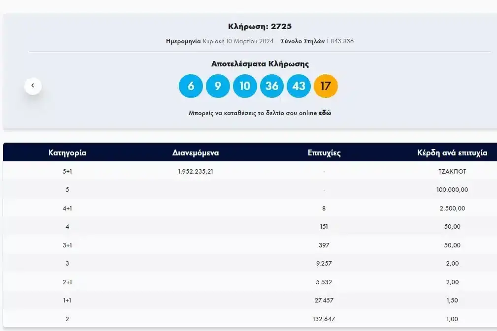 Οι τυχεροί αριθμοί λοιπόν, στη σημερινή κλήρωση Τζόκερ είναι οι εξής: 6, 9, 10, 36, 43 και αριθμός Τζόκερ το 17.