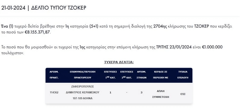 Το ποσό που θα μοιρασθούν οι τυχεροί της 1ης κατηγορίας στην επόμενη κλήρωση της Τρίτης (23/01) είναι τουλάχιστον €1.000.000.