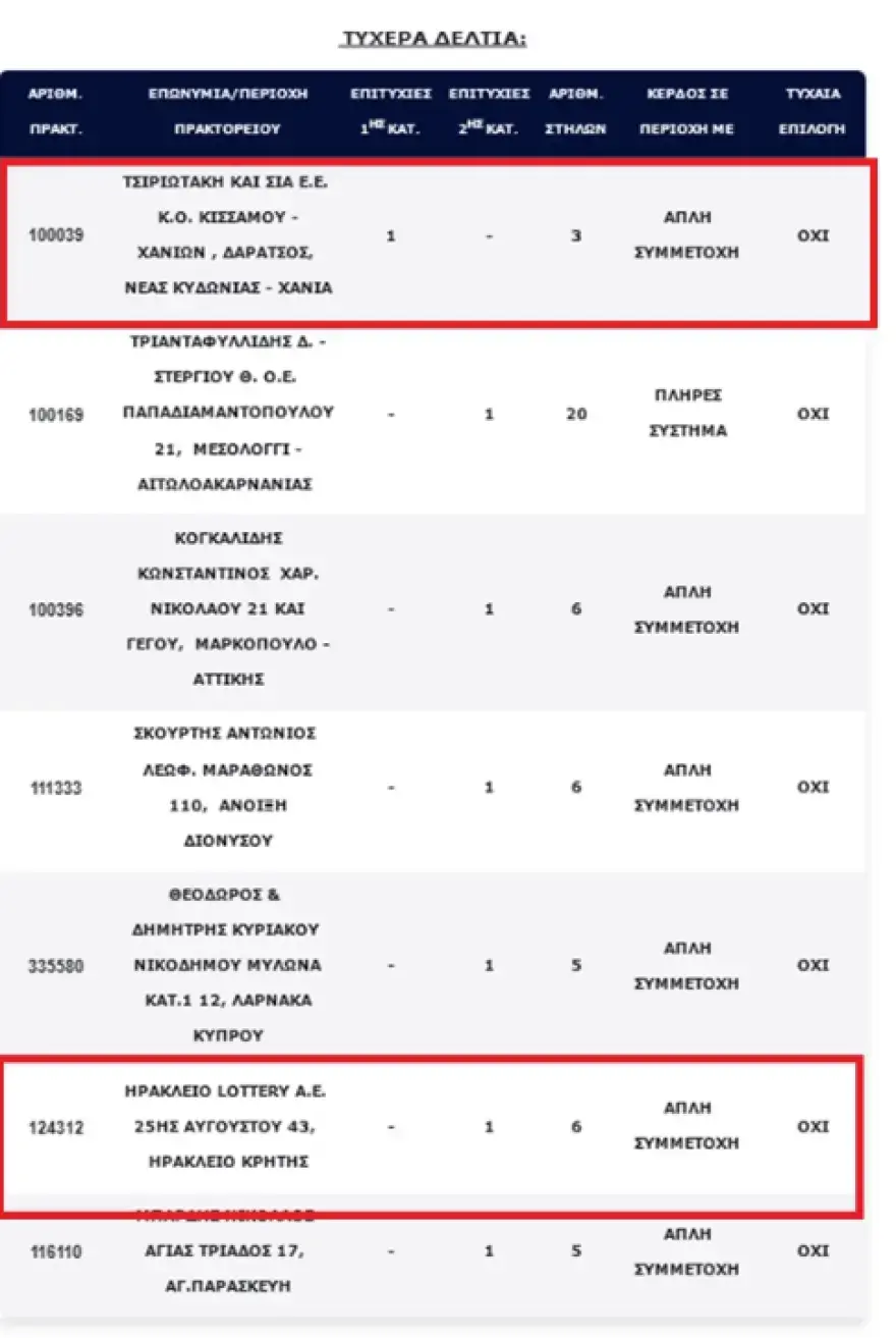 Ένα από τα έξι τυχερά πεντάρια το οποίο κερδίζει το ποσό των €100.000,00 «έπεσε» στο Ηράκλειο και ειδικότερα σε πρακτορείο ΟΠΑΠ επί της 25ης Αυγούστου, στο κέντρο της πόλης.