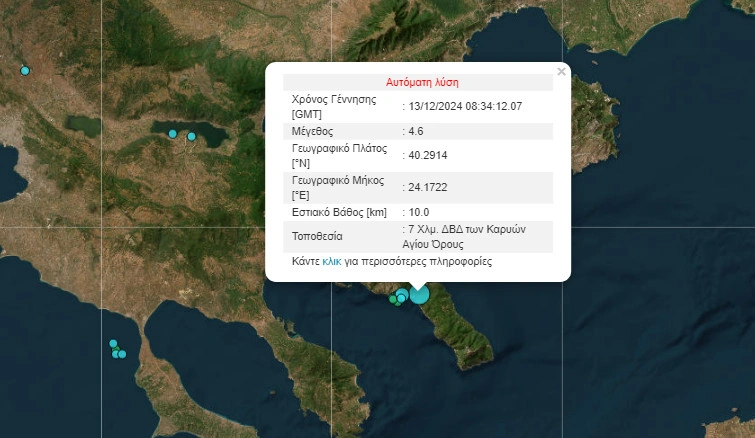 Σύμφωνα με τις πρώτες πληροφορίες από το Γεωδυναμικό Ινστιτούτο, ο σεισμός είχε μέγεθος 4,6 βαθμών της κλίμακας Ρίχτερ και το επίκεντρό του εντοπίστηκε 7 χιλιόμετρα Δυτικά Βορειοδυτικά των Καρυών.