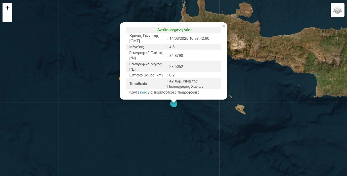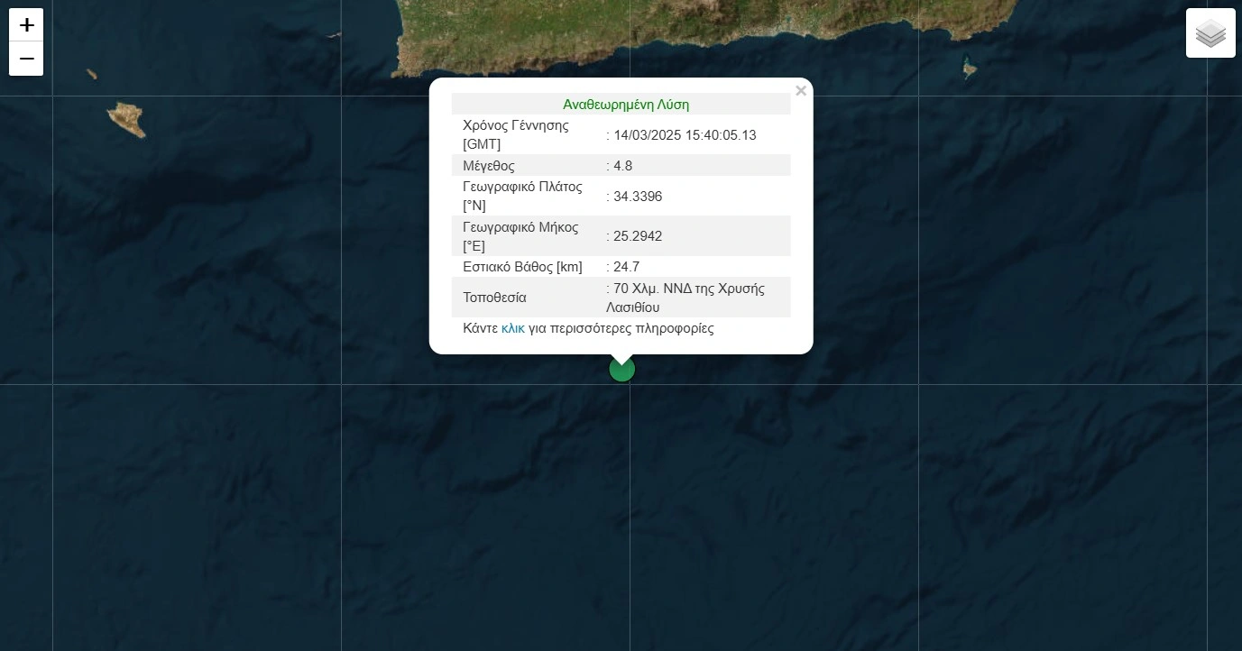 Το επίκεντρό του καταγράφηκε στα 72 χιλιόμετρα νοτιοδυτικά της Χρυσής Λασιθίου.