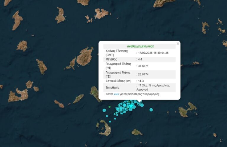 Το εστιακό βάθος μετρήθηκε στα 5 χιλιόμετρα και το επίκεντρο του σεισμού 23 χλμ Νότια – Νοτιοδυτικά της Αρκεσίνης Αμοργού.