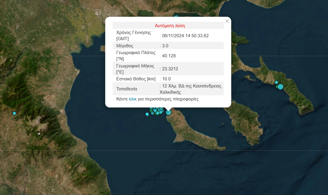 Σύμφωνα με το Γεωδυναμικό Ινστιτούτο, ο σεισμός μεγέθους 3 Ρίχτερ είχε επίκεντρο 12 χλμ βορειοδυτικά της Κασσανδρείας και εστιακό βάθος τα 10χλμ.