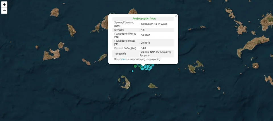Σύμφωνα με το Γεωδυναμικό Ινστιτούτο, ο νέος σεισμός είχε εστιακό βάθος 14,8 Χλμ. και επίκεντρο που υπολογίζεται στα 26 Χλμ. νότια-νοτιοδυτικά της Αρκεσίνης Αμοργού. Προηγήθηκε, στις 20:03, δόνηση μεγέθους 4,1 Ρίχτερ.