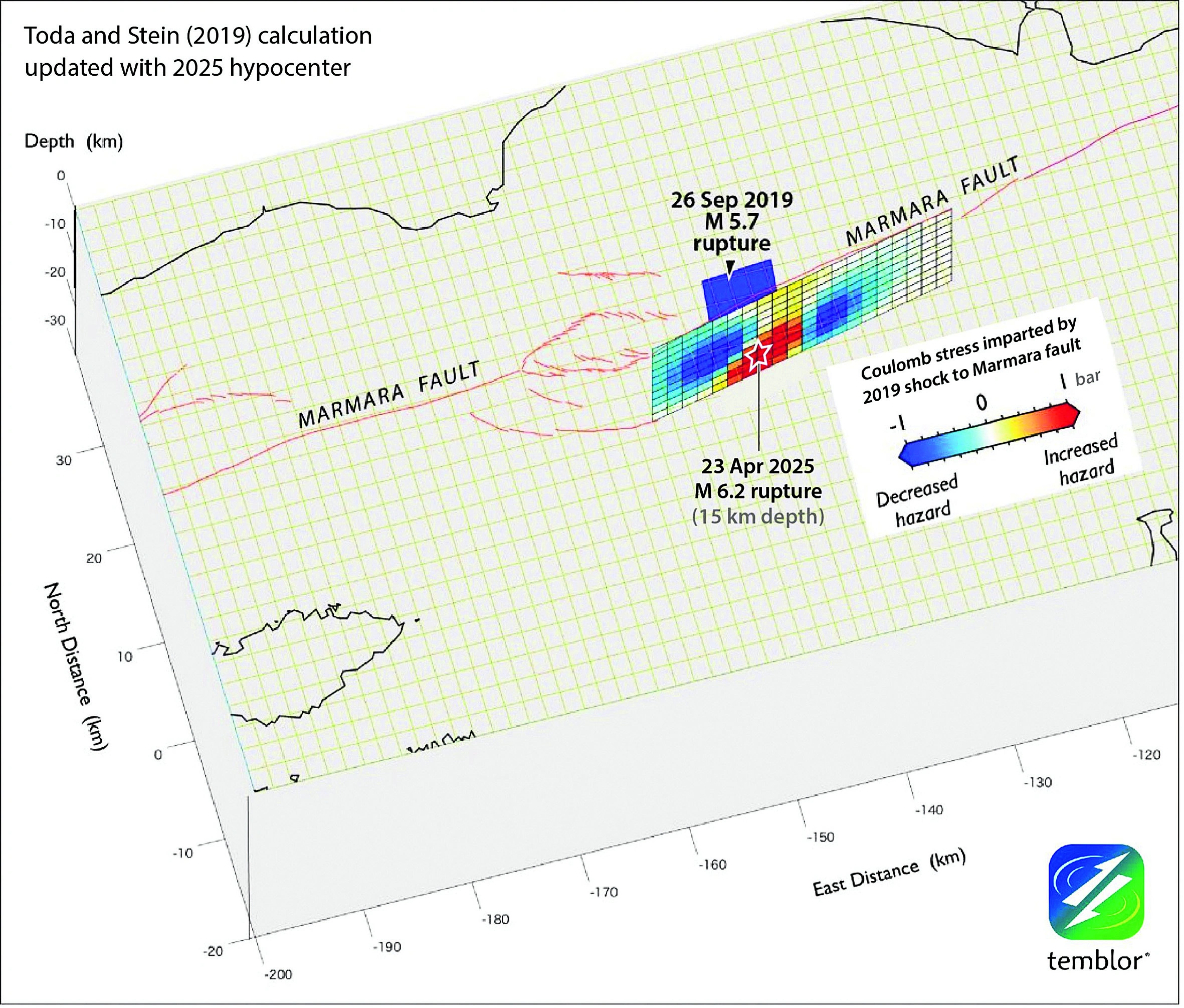 «Δύο εξαιρετικοί Αμερικανοί γεωλόγοι, οι Toda και Stein, είχαν πραγματοποιήσει εκτεταμένες μελέτες στη Θάλασσα του Μαρμαρά και στο ρήγμα της Βόρειας Ανατολίας μετά τον σεισμό του Σεπτεμβρίου του 2019. Υπολόγισαν τη μεταφορά τάσεων (στρες) στο ρήγμα του Μαρμαρά και αποτύπωσαν τα αποτελέσματά τους σε χάρτη. Οι μπλε σκιές τάσης δείχνουν το τμήμα του ρήγματος που προέκυψε από τη θραύση του σεισμού το 2019, ενώ με το κόκκινο χρώμα απεικονίζεται το τμήμα του ρήγματος που το 2019 πλησίαζε σημαντικά στην αστοχία, δηλαδή στην εκδήλωση νέου σεισμού. Ο προχθεσινός σεισμός φαίνεται να έχει χτυπήσει μέσα ή στην άκρη του προωθημένου κομματιού, όπως ακριβώς είχαν διατυπώσει οι δύο επιστήμονες της Γεωλογικής Υπηρεσίας των ΗΠΑ», τόνισε.