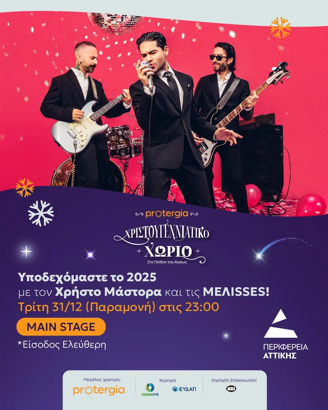 Το βράδυ της παραμονής Πρωτοχρονιάς στις 23.00, το πιο αγαπημένο συγκρότημα της ελληνικής μουσικής σκηνής, μας περιμένει στο main stage του Χωριού, με τις πιο γνωστές τους επιτυχίες, που θα μας γεμίσουν ρυθμό, κέφι και αισιοδοξία, για να υποδεχτούμε τη νέα χρονιά όλοι και όλες μαζί – σαν μια μεγάλη παρέα.