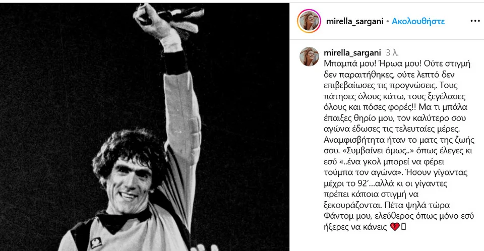 Με μια ανάρτηση στο Instagram αποχαιρετά τον πατέρα της, τον θρυλικό τερματοφύλακα Νίκο Σαργκάνη, η κόρη του Μιρέλλα.