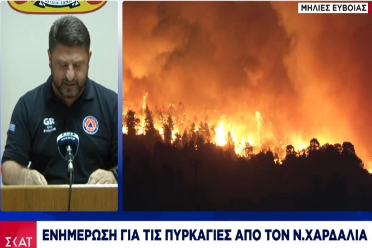 «Στην Εύβοια η μάχη θα συνεχιστεί όλη τη νύχτα, με πολύ μεγάλη ένταση από όλες τις δυνάμεις» τόνισε ο κ. Χαρδαλιάς. Ειδικότερα, ενημέρωσε πως η πυρκαγιά έχει δημιουργήσει δύο μέτωπα, «στο νότιο τμήμα της η κατάσταση είναι σταθερή, προσπαθούμε να τη βελτιώσουμε διαρκώς», ενώ προς το βόρειο τμήμα της η κατάσταση παραμένει εξαιρετικά δύσκολη.