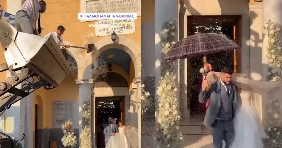 Γαμπρός και νύφη βγήκαν από την εκκλησία και πολύ γρήγορα αναγκάστηκαν να ανοίξουν ομπρέλα και να μπουν από κάτω καθώς βομβαρδίζονταν από το ρύζι που έπεφτε με τόνους. Ο γάμος στη Λακωνία και οι εικόνες που τον συνοδεύουν από το έθιμο με το ρύζι έγιναν viral καθώς οι σκηνές τραβήχτηκαν σε βίντεο που ανέβηκε στο TikTok.