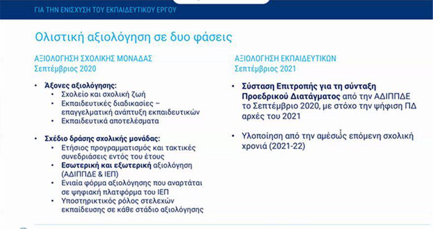 Θεσμοθετείται από το ερχόμενο σχολικό έτος (2020-21) ένα νέο συνεκτικό πλαίσιο για την καλύτερη οργάνωση του ετήσιου προγραμματισμού του εκπαιδευτικού έργου, που συνδυάζεται με το σχεδιασμό συλλογικών και επιμορφωτικών δράσεων για την επαγγελματική ανάπτυξη των εκπαιδευτικών, καθώς και για τη διττή αξιολόγηση σε επίπεδο σχολικής μονάδας: αφενός, εσωτερική αυτό-αξιολόγηση, και αφετέρου εξωτερική αξιολόγηση από το οικείο ΠΕ.Κ.Ε.Σ.. Η εξωτερική αξιολόγηση προβλέπει ενεργό ρόλο του ΙΕΠ καθώς και της ΑΔΙΠΠΔΕ, αρχής που σχετίζεται άμεσα με τη διασφάλιση της ποιότητας στην παρεχόμενη πρωτοβάθμια και δευτεροβάθμια εκπαίδευση. Δρομολογείται, επίσης, εντός του 2020 η σύνταξη του ΠΔ για την αξιολόγηση εκπαιδευτικών.