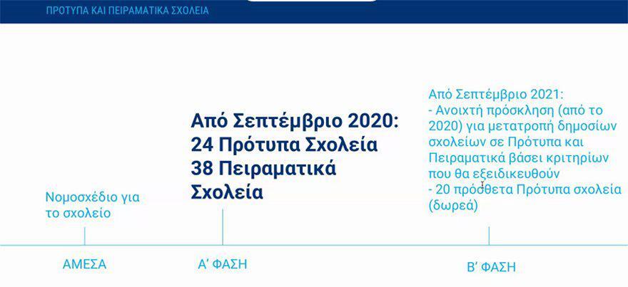 Ενισχύεται και διευρύνεται ο θεσμός των Πρότυπων Σχολείων (ενίσχυση του προτύπου της αριστείας με την έννοια της διαρκούς αυτό-βελτίωσης των μαθητών) και Πειραματικών Σχολείων (έμφαση σε υλοποίηση πειραματικών μεθόδων, πρακτικών και εργαλείων σε τυχαίο δείγμα του μαθητικού πληθυσμού). Τα σχολεία αυτά αποτελούν από κοινού ένα εκπαιδευτικό εργαστήριο εθνικών διαστάσεων για το σχεδιασμό και την εφαρμογή διαφοροποιημένων και καινοτόμων εκπαιδευτικών πολιτικών. Από το Σεπτέμβριο 2020, προβλέπεται η λειτουργία 24 Πρότυπων και 38 Πειραματικών Σχολείων. Από το Σεπτέμβριο του 2021, προβλέπεται η επέκταση του θεσμού, με το χαρακτηρισμό και άλλων δημόσιων σχολείων ως Προτύπων ή Πειραματικών.