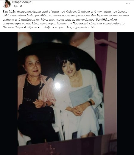 Μέσα από τον λογαριασμό της στο facebook εξήγησε ότι έχει λάβει πάρα πολλά μηνύματα και αποκάλυψε ότι πρόκειται να κάνει ένα χειρουργείο αυτή την Παρασκευή.