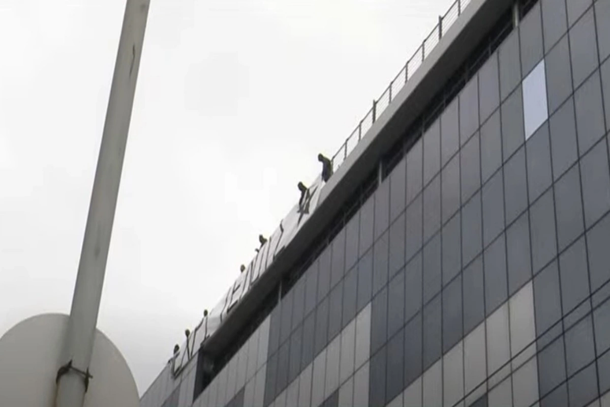 Στο σημείο υπάρχουν ισχυρές αστυνομικές δυνάμεις, τρεις κλούβες τον ΜΑΤ, ενώ παράλληλα άνδρες της ΟΠΚΕ ανέβηκαν πάνω στην ταράτσα, προσέγγισαν τα μέλη του Ρουβίκωνα και τους απομάκρυναν από το σημείο.