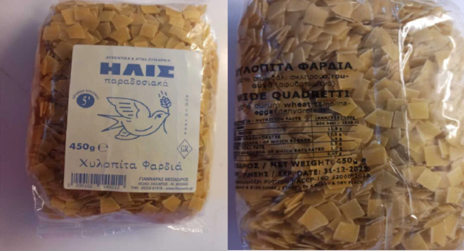 «Ο Ε.Φ.Ε.Τ. και ειδικότερα η Περιφερειακή Διεύθυνση Δυτικής Ελλάδας του Ε.Φ.Ε.Τ., κατά τη διενέργεια επιθεώρησης – διερεύνησης, σχετικά με το τρόφιμο «ΗΛΙΣ Χυλοπίτα Φαρδιά» των 450 gr, το οποίο παράγεται και διακινείται από την επιχείρηση «ΓΙΑΝΝΑΡΑΣ Ι. ΘΕΟΔΩΡΟΣ» στο Θολό Ταξιαρχών στη Ζαχάρω Ηλείας, διαπίστωσε ότι στο πλαίσιο αυτοελέγχου της επιχείρησης, βρέθηκαν ίχνη γάλακτος στο συγκεκριμένο προϊόν, με αριθμό παρτίδας Lot 3902 και ημερομηνία λήξης 31-12-2025 λόγω επιμόλυνσης, χωρίς το ενδεχόμενο αυτό να αναγράφεται στα συστατικά του με τον κατάλληλο τρόπο.