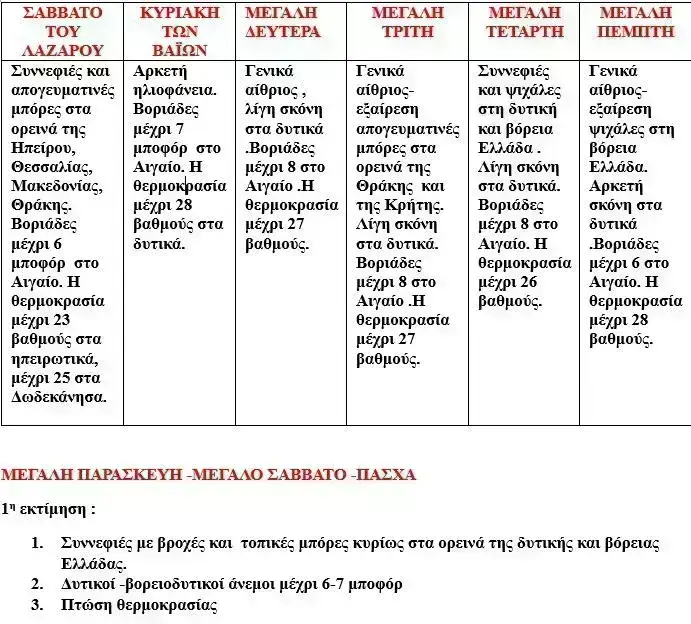 - Το Σάββατο του Λαζάρου αναμένεται συννεφιά και θερμοκρασία έως 25 βαθμοί Κελσίου.