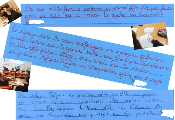 Οι σκέψεις αυτές διατυπώνονται σε απαντήσεις των μαθητών στο ερώτημα του δασκάλου τους στο μάθημα των Θρησκευτικών με διαθεματική προσέγγιση με τα μαθήματα Γλώσσας και Ιστορίας: «Αυτή την ώρα συναντιούνται εκπρόσωποι Ρωσίας- Ουκρανίας για να συζητήσουν για τον πόλεμο. Αν ήσουν εκεί και ρωτούσαν τη γνώμη σου, τι θα τους συμβούλευες;».1 Στα μηνύματα – tweets που έγραψαν οι μαθητές, εκφράζονται αλήθειες, διαπιστώνονται αιτίες και συνέπειες του πολέμου, ενώ προτείνονται τρόποι αντιμετώπισης.