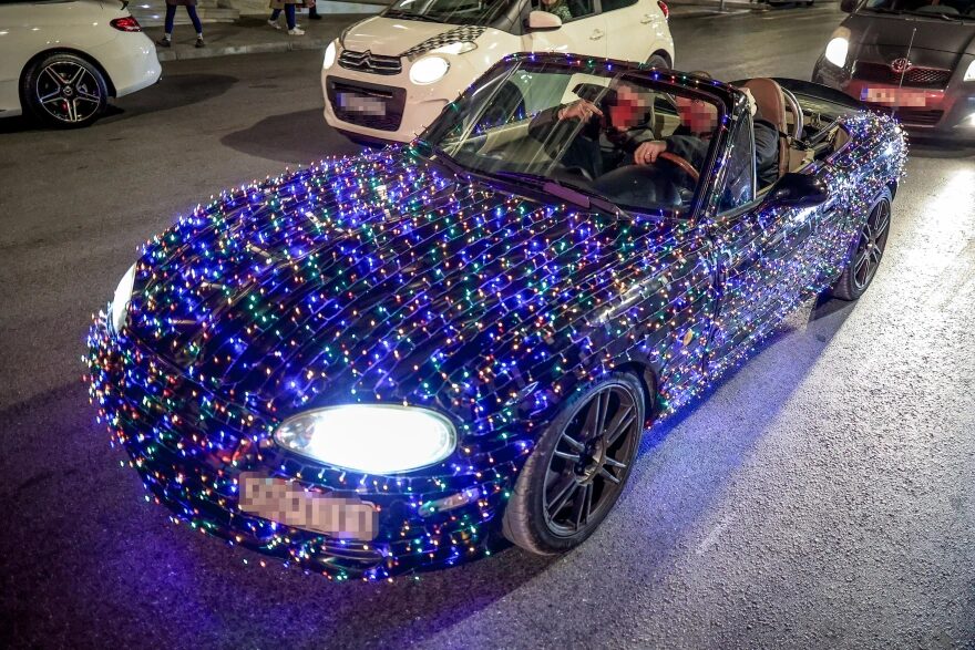 Σύμφωνα με το πρακτορείο Eurokinissi που κατέγραψε την περίεργη εικόνα του αυτοκινήτου, ο στολισμός ήταν συνολικά 2.500 χριστουγεννιάτικα λαμπάκια.