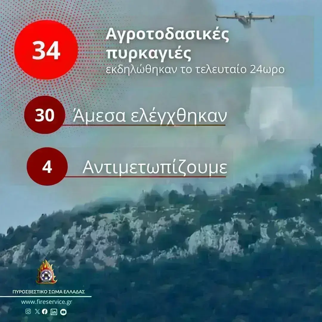 Από τις 18:00 (23-6) 2024 έως τις 18:00 (24-6) εκδηλώθηκαν 34 αγροτοδασικές πυρκαγιές, από τις οποίες οι 30 αντιμετωπίστηκαν άμεσα, στο αρχικό τους στάδιο, ενώ οι πυροσβεστικές δυνάμεις αντιμετωπίζουν ακόμη τέσσερις.