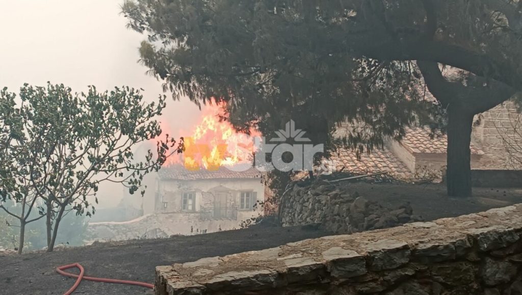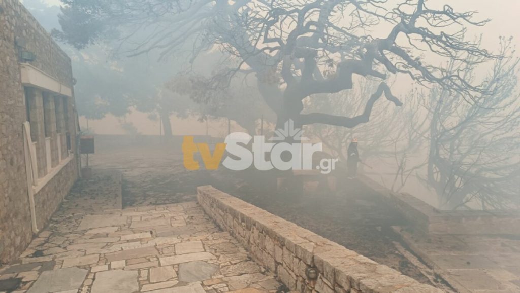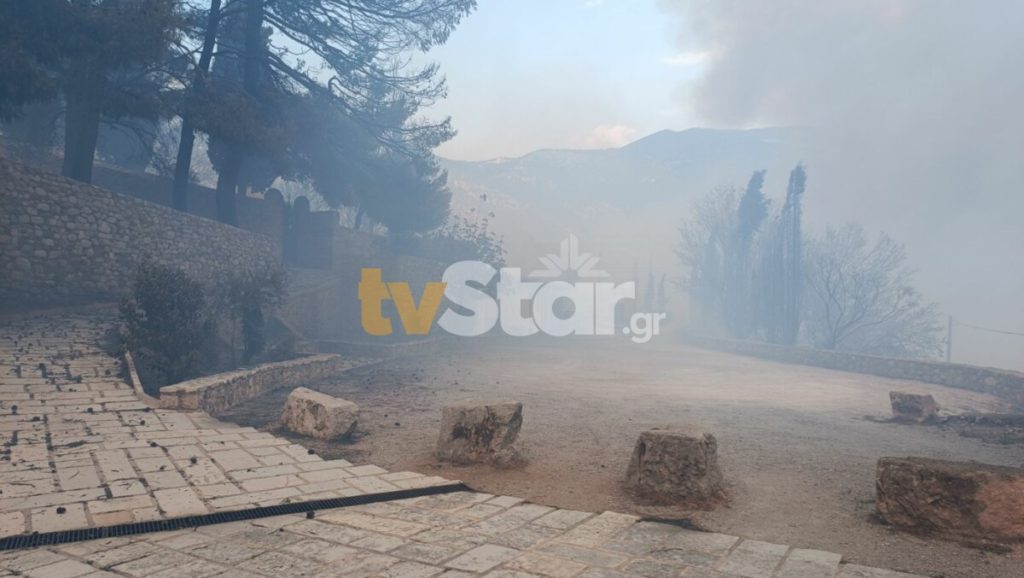 Η πυρκαγιά στο πέρασμά της έκαψε ολοσχερώς τον περίβολο του ιστορικού μοναστηριού. Οι πρώτες φλόγες ξεπήδησαν στο εσωτερικό της Μονής και καίνε ένα από τα παλαιότερα κτίρια. Ευτυχώς, έγκαιρα το μοναστήρι εκκενώθηκε από επισκέπτες και μοναχούς.