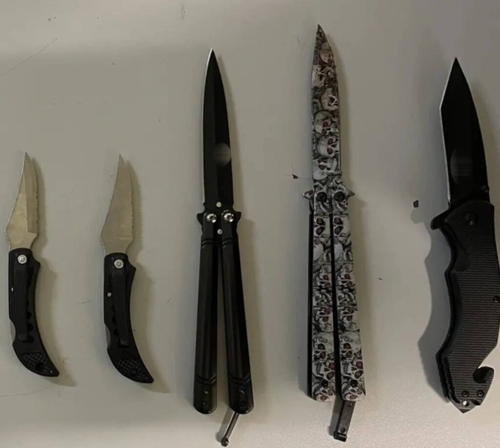 Στο πλαίσιο του ελέγχου βρέθηκαν στην κατοχή των -5- ανηλίκων συνολικά -5- μαχαίρια που κατείχαν, εκ των οποίων, τα δύο μαχαίρια τύπου πεταλούδα συνολικού μήκους -22- και -21- εκατοστών τα οποία κατείχαν δύο 14χρονοι.
