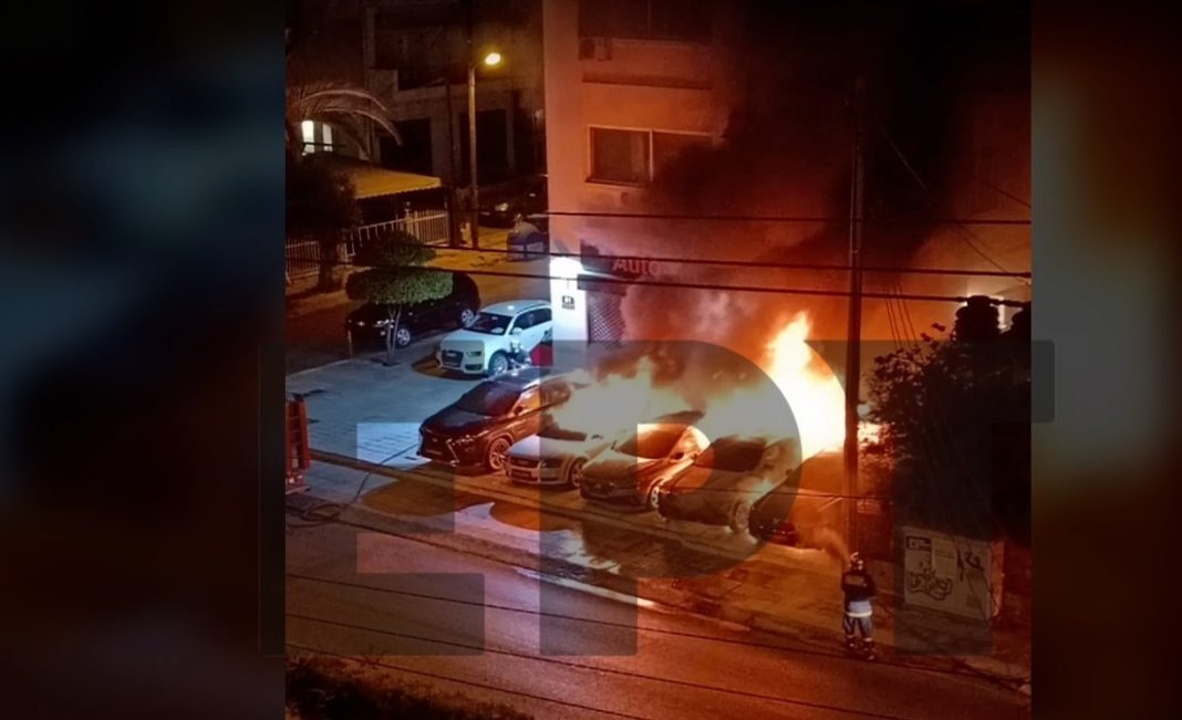 Από τα πρώτα στοιχεία προκύπτει ότι η πυρκαγιά προκλήθηκε από εμπρησμό και είχε ως αποτέλεσμα να καταστραφούν πέντε αυτοκίνητα.
