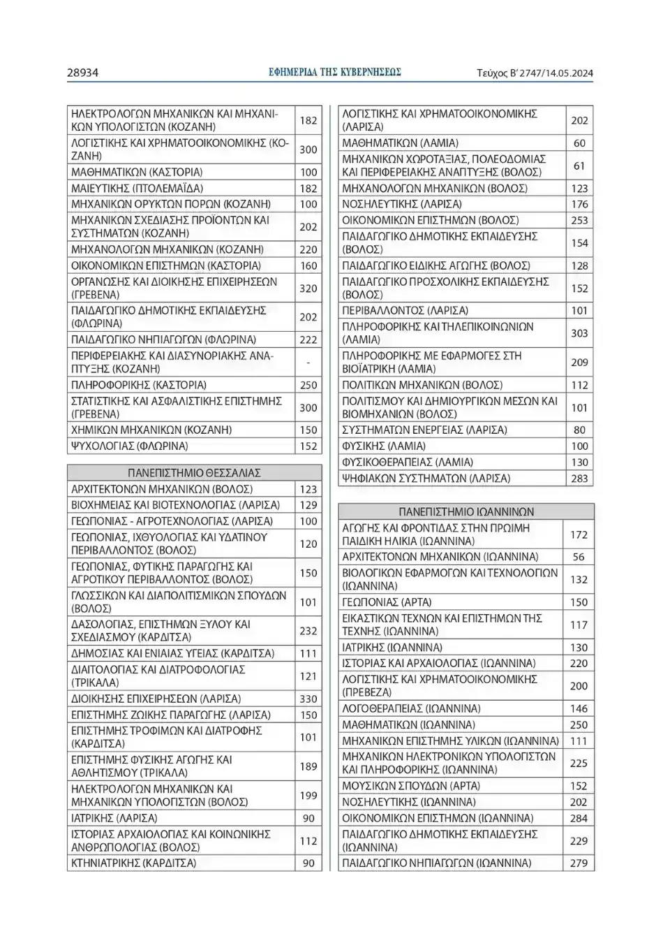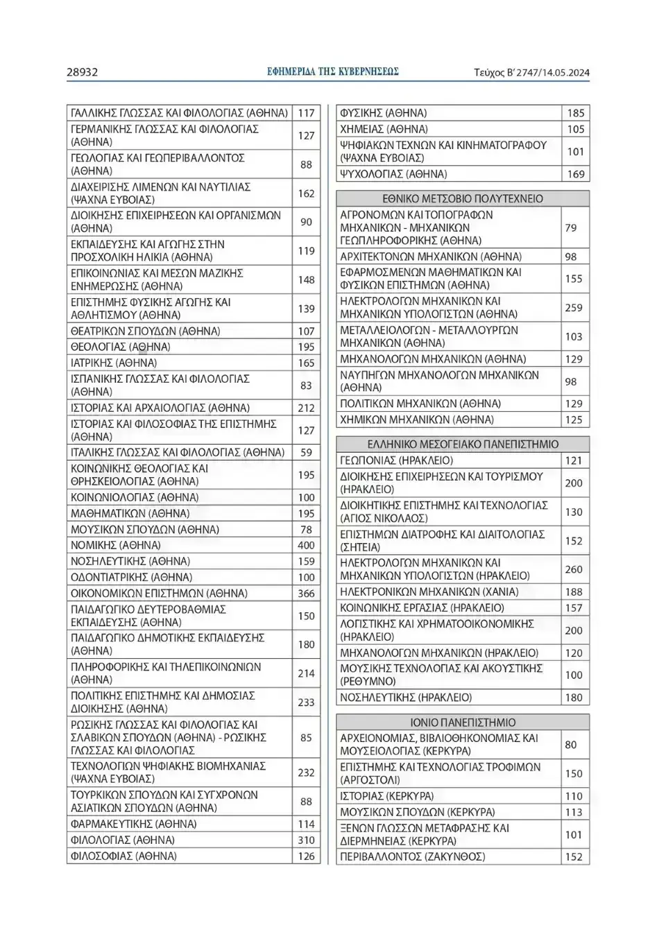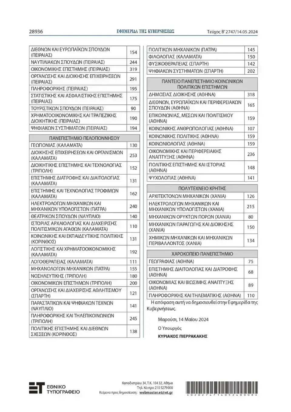 Όπως αναφέρει η Υπουργική Απόφαση, ο συνολικός αριθμός των εισακτέων για την επόμενη ακαδημαϊκή χρονιά θα ανέλθει σε 68.851, έναντι 68.574 θέσεων που ανήλθαν κατά το ακαδημαϊκό έτος 2023-2024.