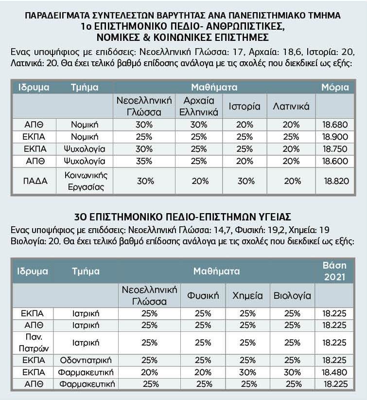 Για παράδειγμα, οι Νομικές σε Θεσσαλονίκη και Αθήνα έχουν διαφοροποιημένους συντελεστές, με την πρώτη σχολή να «πριμοδοτεί» με 30% συντελεστή τα μαθήματα της Νεοελληνικής Γλώσσας και των Αρχαίων, ενώ στη δεύτερη περίπτωση «μοιράζεται» και στα τέσσερα μαθήματα ο ίδιος συντελεστής βαρύτητας (25%). Ενας υποψήφιος διεκδικεί με διαφορετικό μέσο όρο επίδοσης τη Νομική Θεσσαλονίκης απ’ ό,τι τη Νομική Αθήνας.
