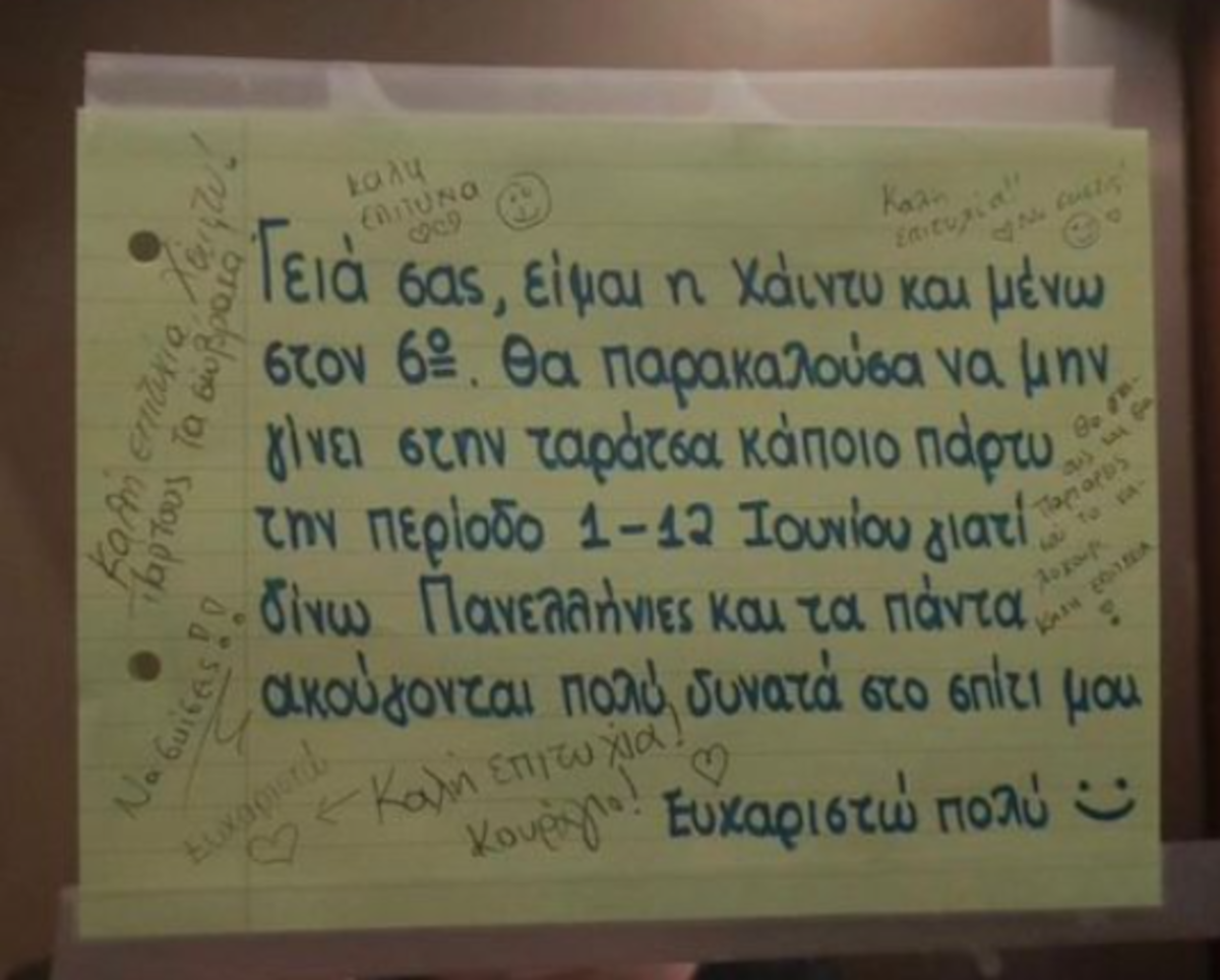 «Γεια σας, είμαι η Χάιντυ και μένω στον 6ο. Θα παρακαλούσα να μην γίνει στην ταράτσα κάποιο πάρτυ την περίοδο 1-12 Ιουνίου γιατί δίνω Πανελλήνιες και τα πάντα ακούγονται πολύ δυνατά στο σπίτι μου. Ευχαριστώ πολύ» γράφει στο σημείωμά της η μαθήτρια.