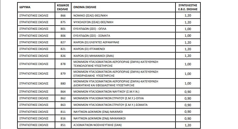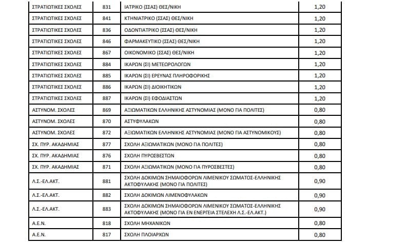 Στις στρατιωτικές και στις αστυνομικές σχολές δεν υπήρξε καμία μεταβολή, καθώς ήδη από πέρσι οι Σχολές Ευελπίδων και οι Σχολές Μονίμων Υπαξιωματικών Στρατού και Ναυτικού και οι Σχολές Ναυτικών Δοκίμων είχαν μειώσει το συντελεστή.