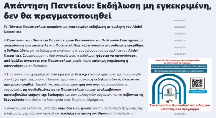 «Το Πάντειο Πανεπιστήμιο ενημερώθηκε με ιδιαίτερη έκπληξη ότι προγραμματίζεται εκδήλωση εντός των χώρων του με ομιλητή τον Abdel Nasser Issa και με διοργανωτές άγνωστες στο Πανεπιστήμιο οργανώσεις.