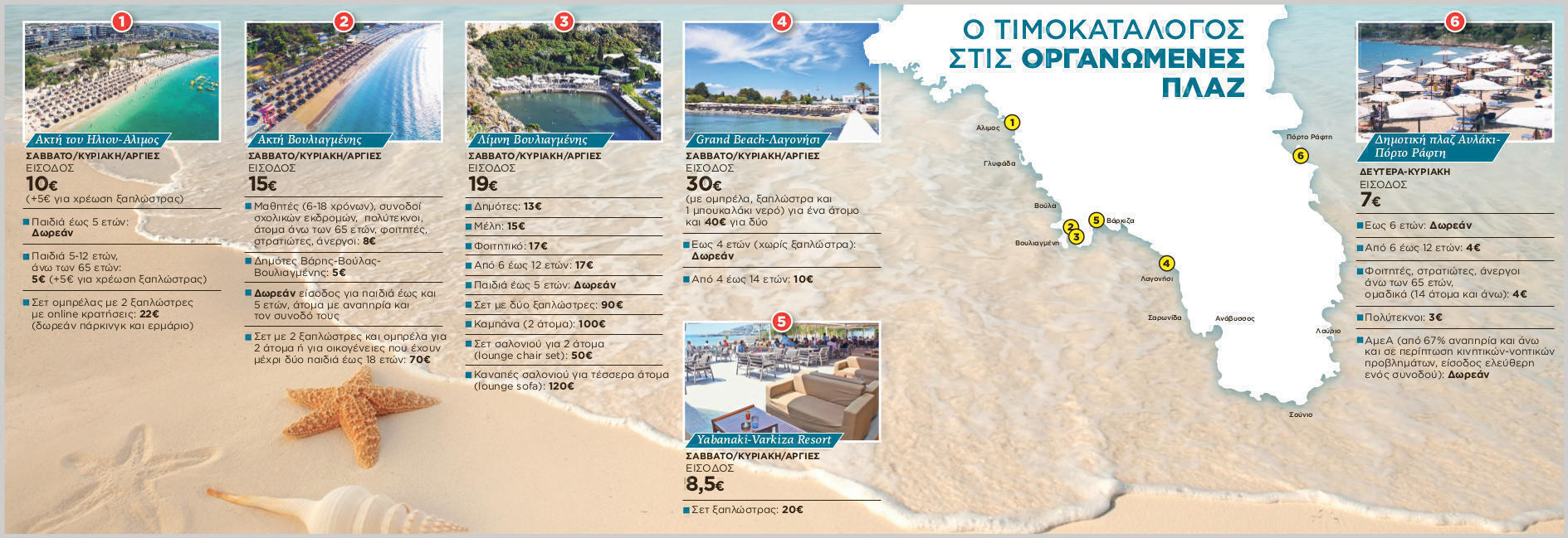 Οι τιμές στις περισσότερες οργανωμένες παραλίες ανεβαίνουν τα Σαββατοκύριακα και τις αργίες, ανάλογα με τις παροχές που προσφέρονται στον λουόμενο. Οι τιμές στις ξαπλώστρες, που συνήθως διατίθενται σε σετ των δύο, μπορεί να κοστίσουν από 10 έως και 120 ευρώ για τετραμελή παρέα στις πιο «κοσμοπολίτικες» πλαζ του Λεκανοπεδίου. Και βεβαίως, ακριβότερα χρεώνονται στην πρώτη σειρά, κοντά στη θάλασσα, και διαφορετικά όσον αφορά στα είδη της ξαπλώστρας (καναπέδες κ.λπ.). Τα πράγματα αλλάζουν όταν πρόκειται για online κρατήσεις, όπου οι τιμές διαφέρουν και συνήθως είναι πιο «τσουχτερές».