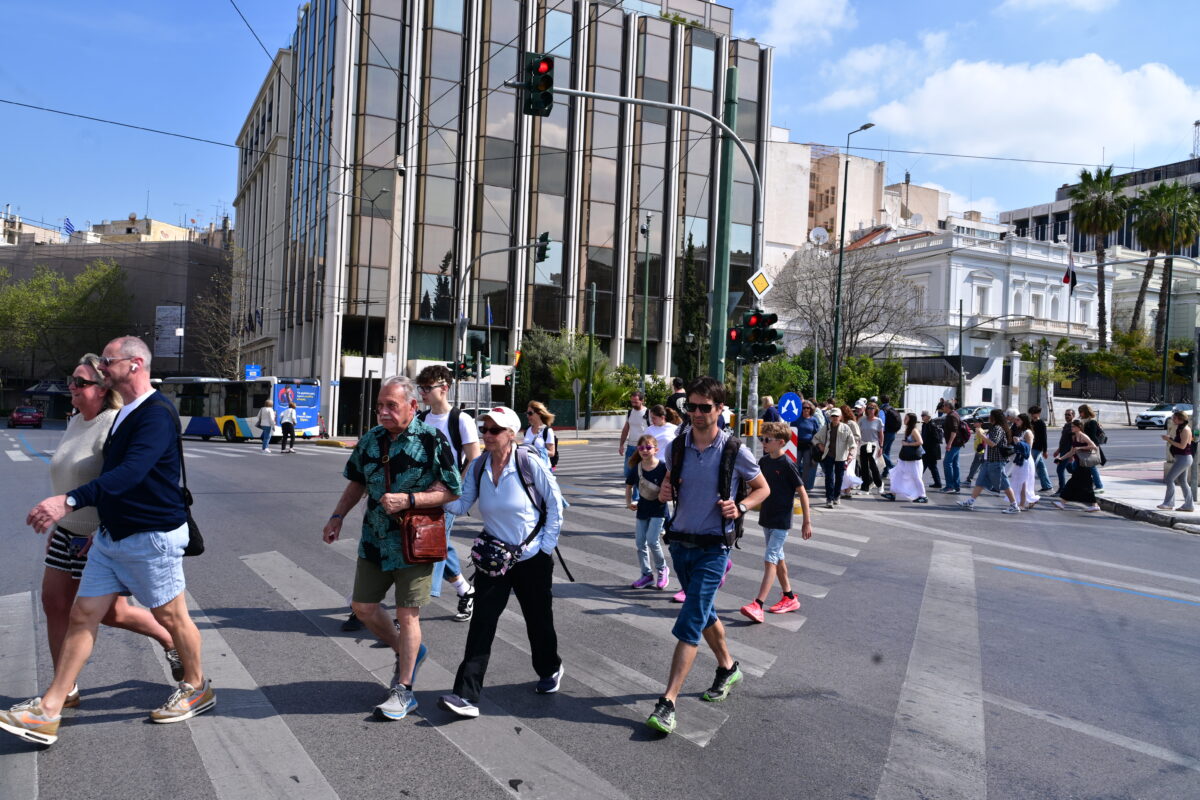 Τη θέση των κατοίκων πήραν οι επισκέπτες της πόλης, οι οποίοι εκμεταλλεύτηκαν την ησυχία για να περιηγηθούν με άνεση στα ιστορικά αξιοθέατα και τους κεντρικούς δρόμους της Αθήνας.