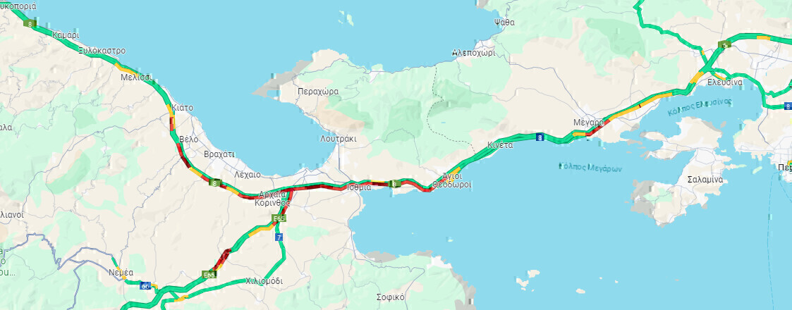 Στις 19.00 το απόγευμα, στο «κόκκινο» καταγραφόταν η κίνηση στην εθνική οδό Αθηνών – Κορίνθου. Από τα διόδια του Ισθμού μέχρι και την Κινέττα μάλιστα, σε πολλά σημεία τα οχήματα ακινητοποιούνταν λόγω μποτιλιαρίσματος από τη μαζική επιστροφή μετά το Πάσχα.
