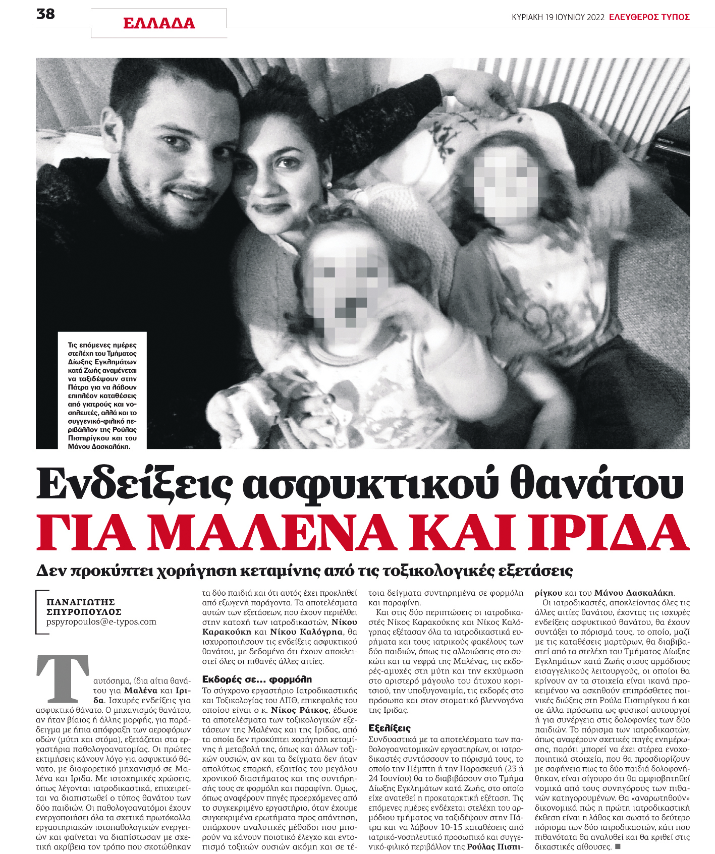 Στην 6 μηνών Ιριδα, ο θάνατος είναι και σε αυτή την περίπτωση ασφυκτικός και αναδεικνύεται, όπως εξηγείται στο πόρισμα των ιατροδικαστών, από τις κακώσεις που είχε εν ζωή στο στοματικό βλεννογόνο και στο άνω χείλος του στόματος, σε συνδυασμό με πανάκι που είχε ικανή ποσότητα αίματος από τις κακώσεις.