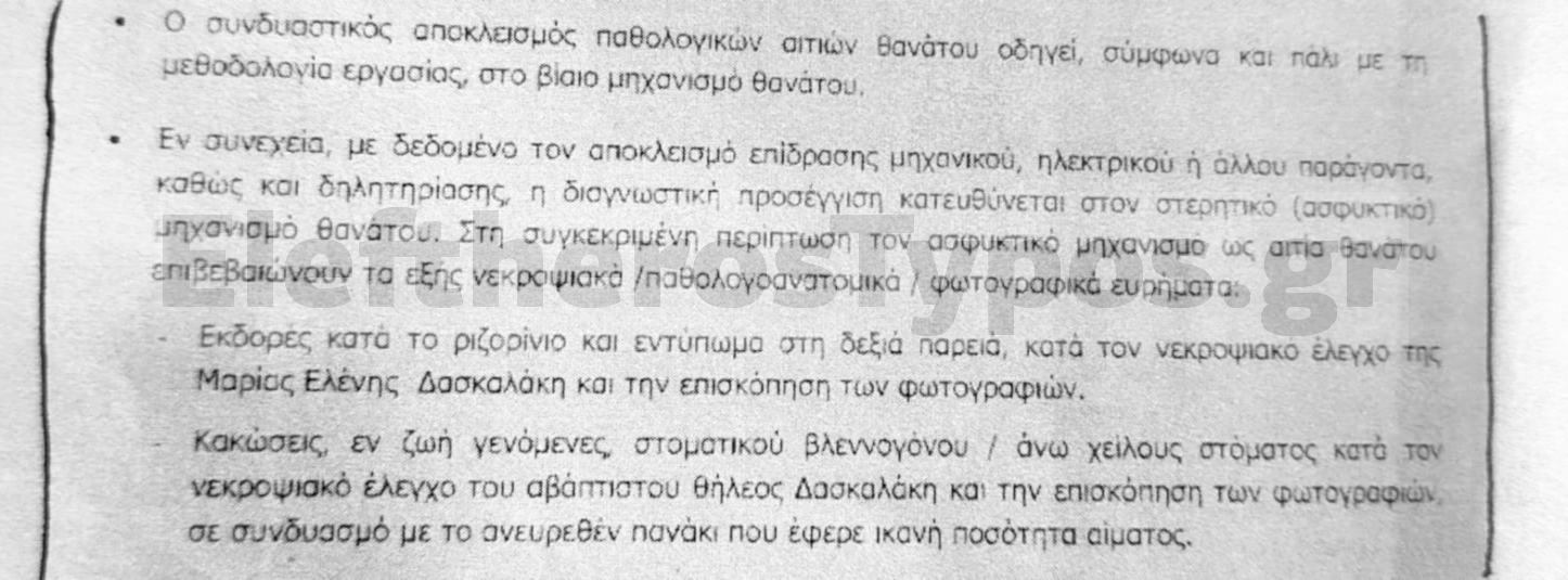Σε αυτό το συμπέρασμα καταλήγει με αναλυτικό τρόπο, σε 20 σελίδες, το πόρισμα των ιατροδικαστών Νίκου Καρακούκη και Νίκου Καλόγρηα, χωρίς να αφήνει αμφισβητήσεις πως πρόκειται για εγκληματικές ενέργειες από… εξωγενή παράγοντα. Οι ιατροδικαστές εξηγούν πώς συνδυαστικά απέκλεισαν όλα τα παθολογικά αίτια θανάτου και ανέδειξαν αυτά του βίαιου μηχανισμού θανάτου.